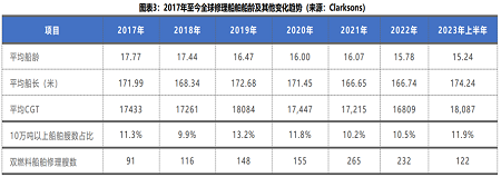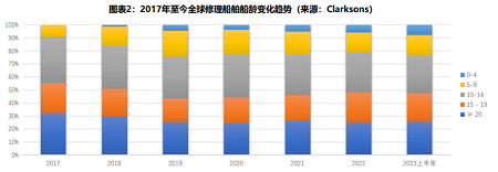 從2017年到2023年,20年及以上船齡的船舶占比由32%下降到25.7%;15-19年船齡的船舶修理由23%下降到22%;10-14年船齡船舶修理由34%下降到29%;而10年以下船齡的船舶修理占比則由10%上升到23%。隨著全球環(huán)保法規(guī)的增加,老舊船舶的淘汰將逐漸增多,修船船齡將持續(xù)呈年輕化趨勢發(fā)展。從統(tǒng)計數據來看,全球修船平均船齡已經由2017年的17.77年下降到2023年的15.24年。