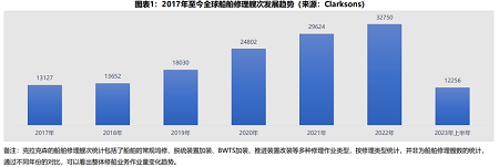 通過表1分析2017年至今船舶修理的主要數據情況可以看出,全球船舶在2023年上半年主要呈現以下修理特點: