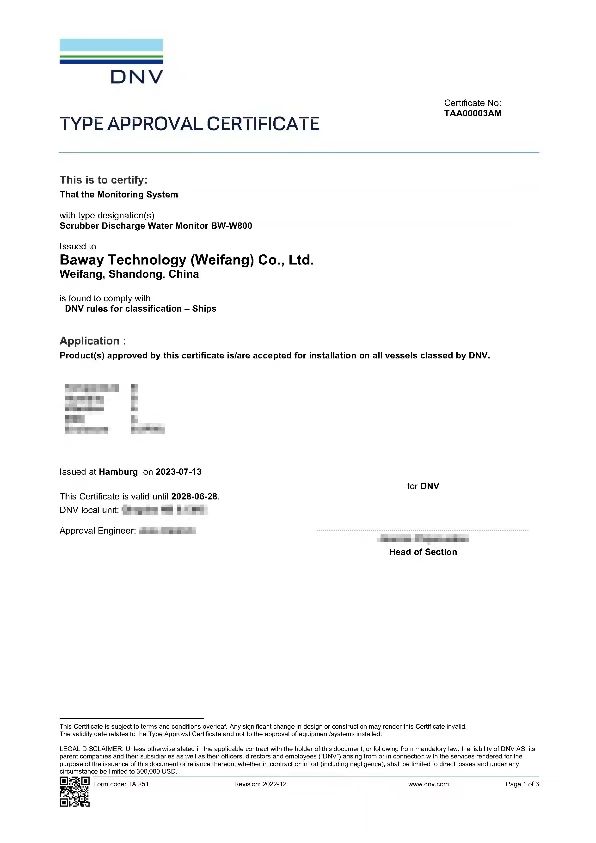 發(fā)布時(shí)間:2023-07-21 點(diǎn)擊量:36512023年7月1日,貝威科技有限公司成功獲得挪威船級(jí)社(DNV)頒發(fā)的型式認(rèn)可證書,成為中國首個(gè)獲得DNV認(rèn)可的脫硫塔洗滌水檢測儀制造商。該認(rèn)證標(biāo)志著中國制造的高端船舶檢測儀器儀表已達(dá)到國際先進(jìn)水平。