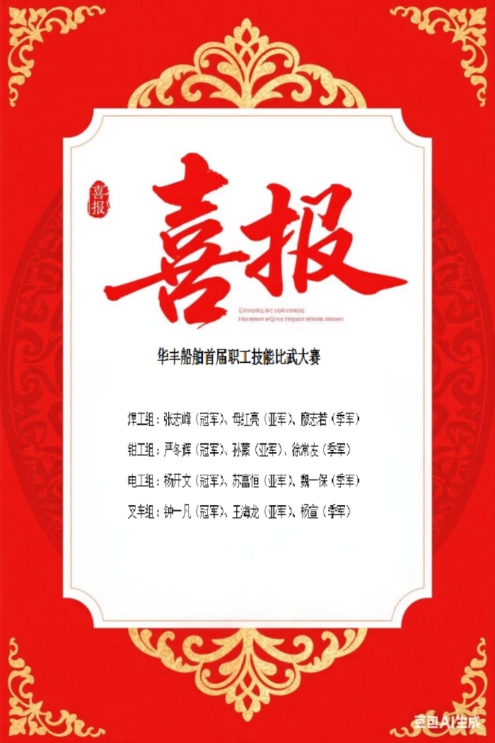 “這是技能的擂臺,更是成長的舞臺。”大賽的成功舉辦,標(biāo)志著華豐船舶在弘揚(yáng)工匠精神、構(gòu)建人才梯隊(duì)方面邁出堅(jiān)實(shí)步伐。未來,公司將持續(xù)深化"干一行、愛一行、精一行"的企業(yè)文化,讓員工成長與企業(yè)發(fā)展戰(zhàn)略同頻共振,共同書寫高質(zhì)量發(fā)展新篇章!