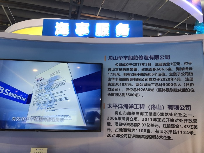 In the early stage, through the recommendation of Zhoushan City Bureau of Commerce, Zhejiang Province Service Trade Association actively planned, Zhoushan Huafeng with bright performance in recent years in the Zhejiang exhibition area stood out. The exhibition focused on the ability and performance of special ship maintenance such as desulfurization tower modification, bulb bow modification, wind power installation ship, which is a concentrated appearance of the company to participate in global competition, and will also win more business opportunities for future business development.